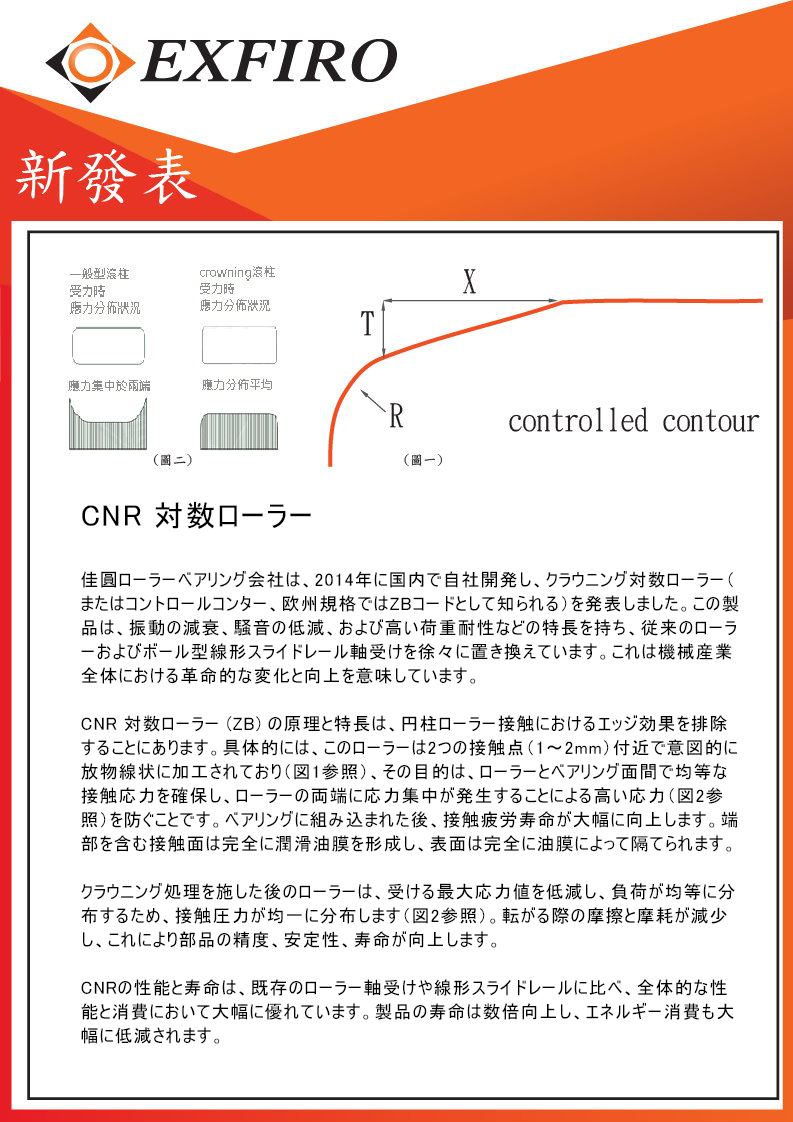 2014年に佳圓ローラーベアリング株式会社が国内で自社開発したCROWNING対数ローラー(「コントロールドコンツアー」とも呼ばれ、欧州規格では「ZB」と表記)を発売しました。